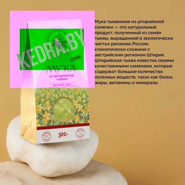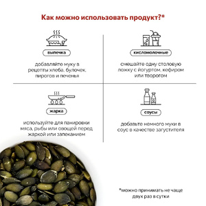 Тыквенная мука — натуральная обезжиренная мука из семечек штирийской голосемянной тыквы. Сырьё — тыква с характерным ярким вкусом: после отжима масла жмых бережно сушат и перемалывают до мелкого помола. В составе нет пшеницы и других злаков с глютена, поэтому она часто используется как безглютеновая альтернатива. Если вам важен строгий режим «без глютена», ориентируйтесь на информацию производителя и условия производства.