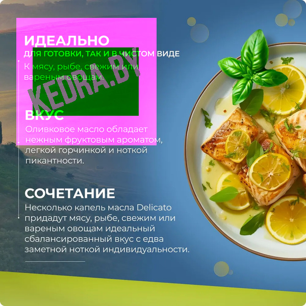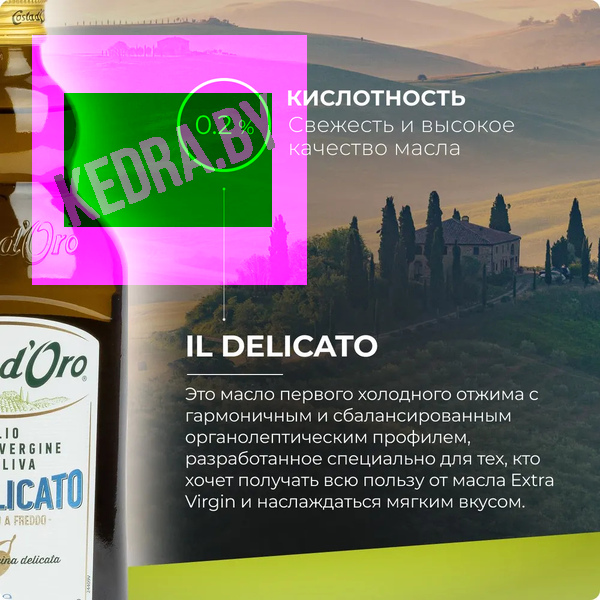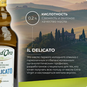 Delicato — это масло первого холодного отжима с гармоничным и сбалансированным органолептическим профилем, разработанное специально для тех, кто хочет получать всю пользу масла Extra Virgin и мягкий вкус.